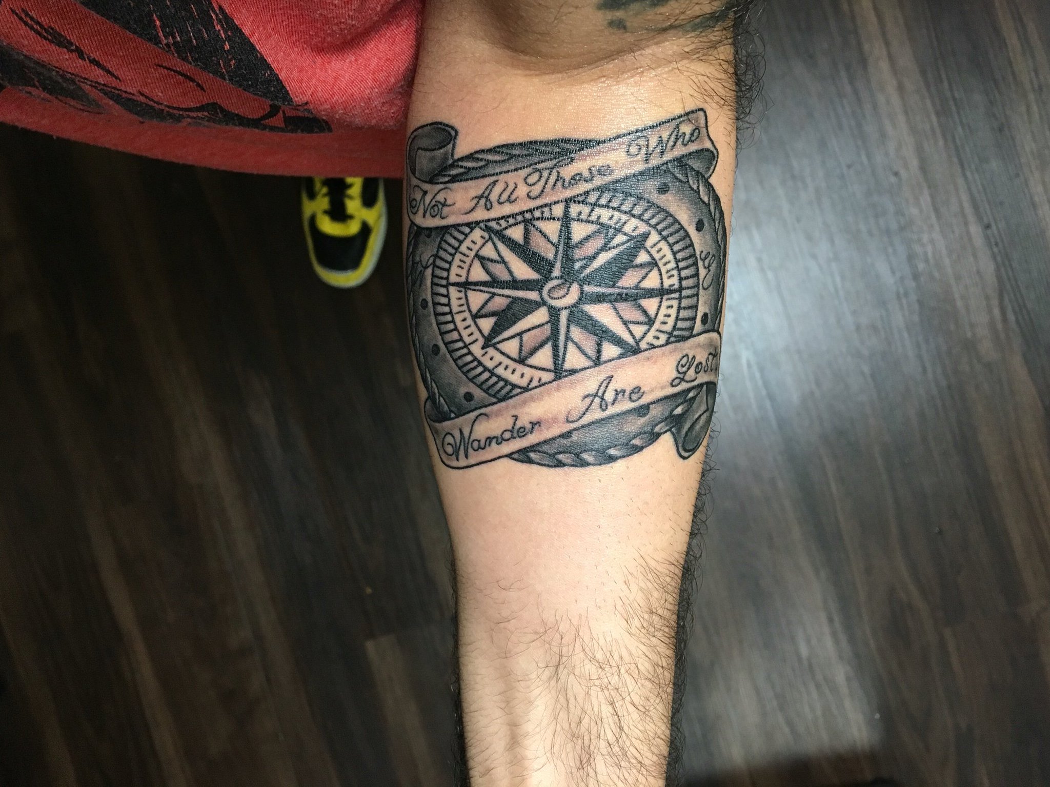 Tiny compass tattoo on left forearm. Not all those who wander are lost. Feather and compass tattoo on arm sleeve. Can be applied to almost any surface. Albeit the phrase is same, the location of this tattoo has its own importance. Our wide selection is elegible for free shipping and free returns. Compasses have been used for centuries to guide travelers back home or to a new destination. It also features large letters to denote the directions of the four winds along with the quote, not all those who wander are lost. this tattoo would be a good reminder that just because they wander whichever way the wind blows, does not mean they have lost. Designer victoria beckham enlisted emma, geri, mel b, and mel c to model her new pride collection. Not all those who wander are lost. This is maybe the quote tattoo to. Tolkien's the fellowship of the ring have rung true with generations since he wrote them. Not all those who wander are lost compass vinyl decal.